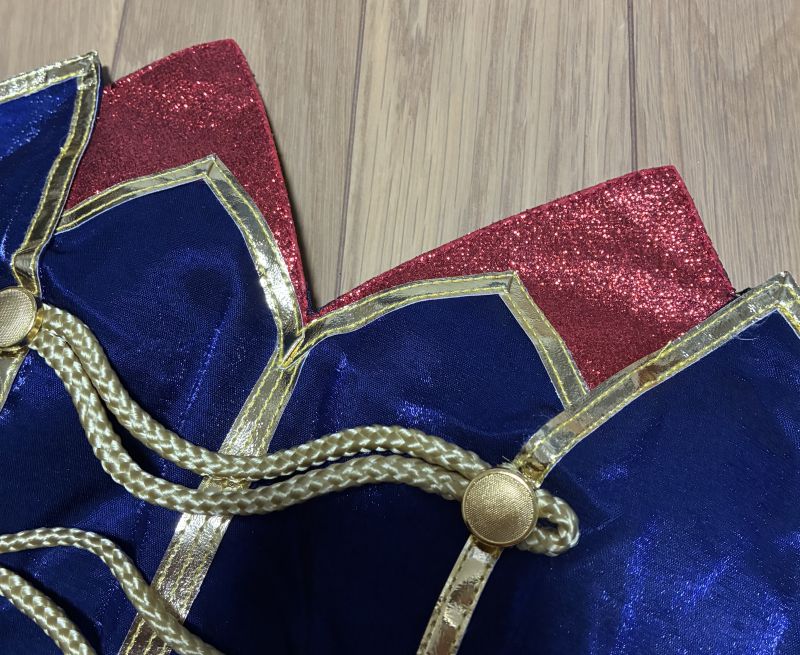 注意するところは、胸のところのラメが取れやすく着る時に衣装や床がキラキラになりました。あと腰の紺色のスカートみたいなやつが下からだと着れず、上からでもギリギリ着れるくらいのサイズなので着替えるのが大変です。